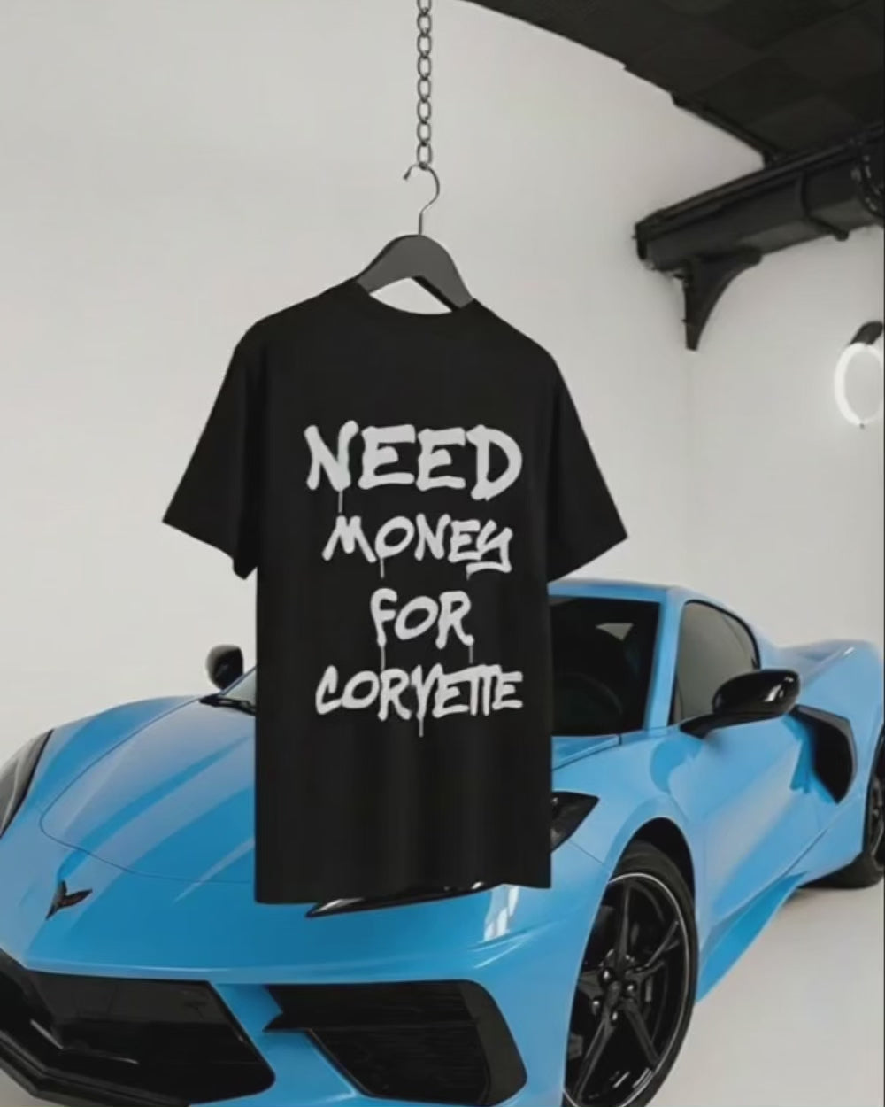 This white T-shirt from the Need Money for Corvette Collection is for those who aren’t afraid to show ambition. Featuring the bold statement “I want money for my Corvette,” it expresses your drive to achieve what you want in a direct, confident, and stylish way. Perfect for those who want to stand out and make it clear they’re focused on their goals.